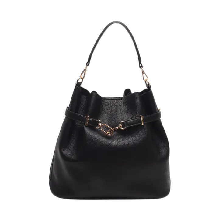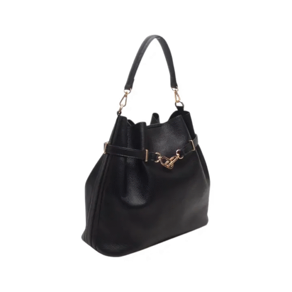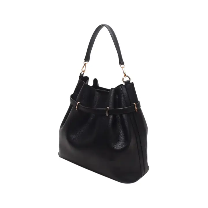 Bucket bag with handle and shoulder strap, zip closure and decorative drawstring