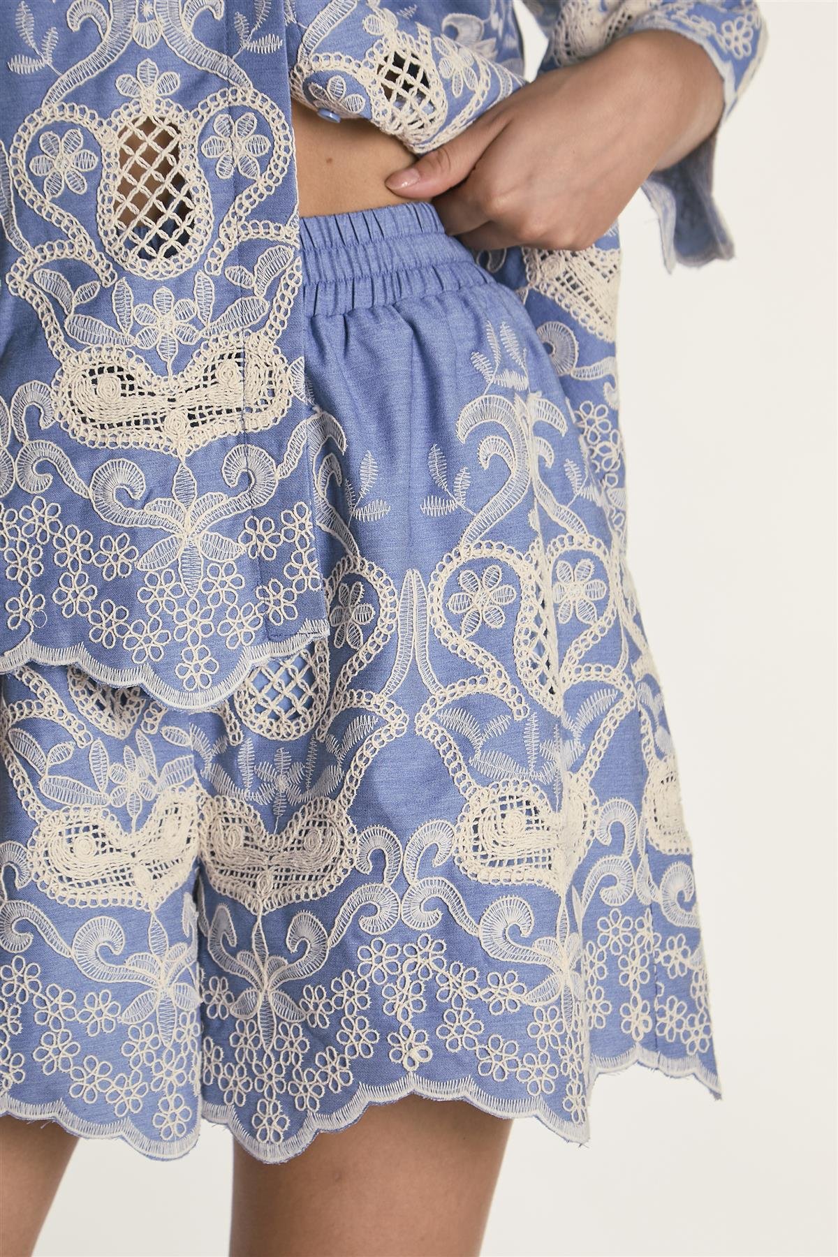 Effortlessly elevate your casual look with these embroidered chambray high-rise shorts, designed to bring comfort and a touch of delicate charm to your everyday style. Featuring beautiful embroidery detailing that adds texture and personality, they offer a regular fit that feels easy and relaxed. The elasticated waistband ensures a comfortable, flexible fit that moves with you, while the scallop trim creates a soft, feminine edge that catches the eye. Fully lined for confidence and comfort, these shorts are perfect for pairing with your favourite simple tops for a laid-back yet polished look that feels natural and timeless.