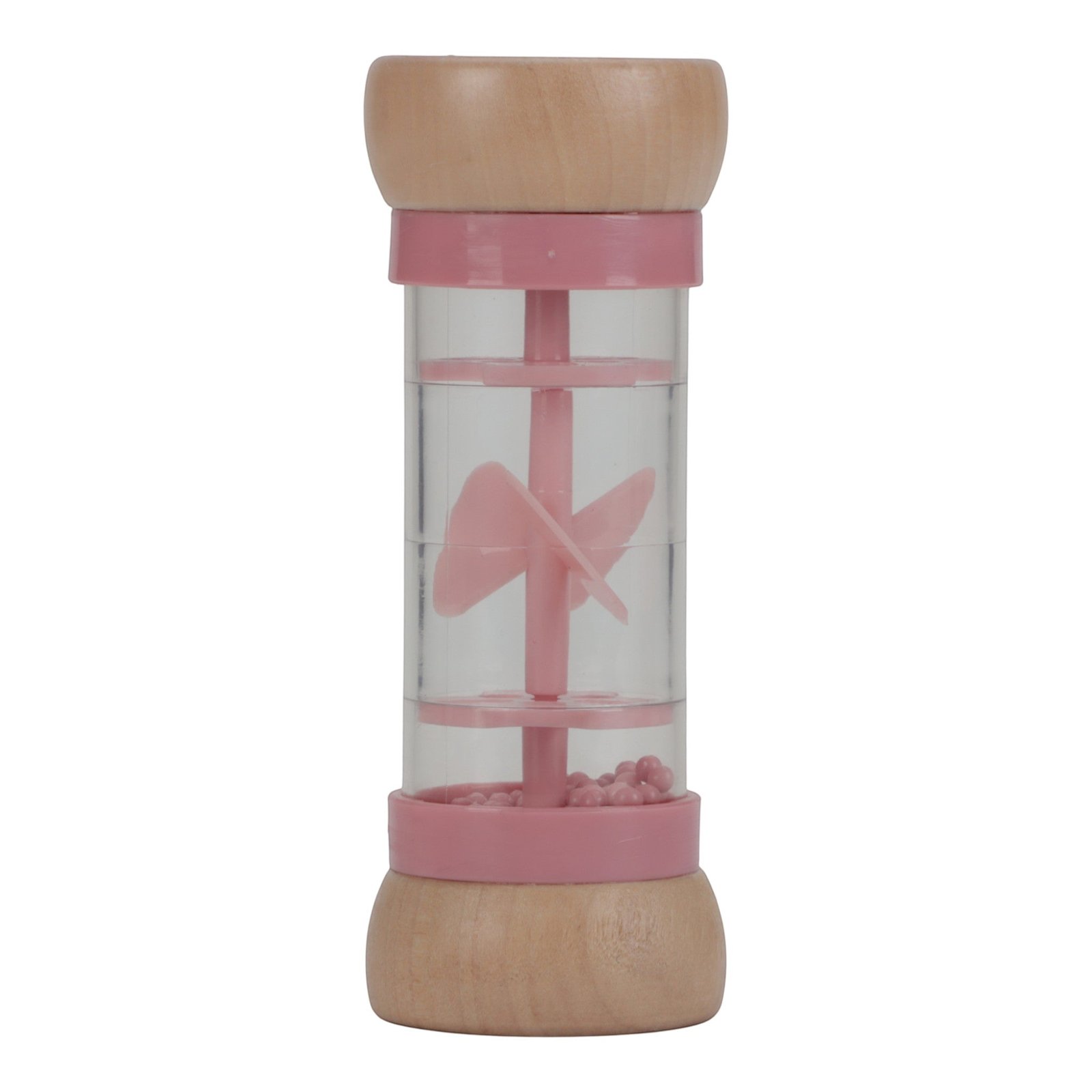 Οι χάντρες πέφτουν μέσα από μικρά ανοίγματα κάνοντας την προπέλα να περιστρέφεται, με αποτέλεσμα την δημιουργία ενός ευχάριστου ήχου. Η κουδουνίστρα βροχής είναι σχεδιασμένη για τα μικρά χεράκια, για εύκολο κράτημα, ενώ παράλληλα διεγείρει τις αισθήσεις του μωρού.