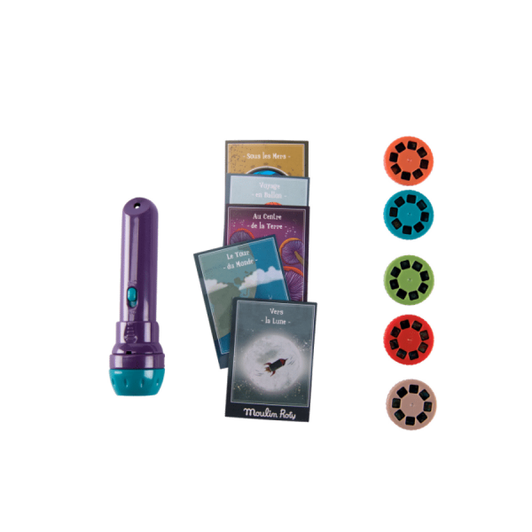 Κουτί με οθόνη προβολής, όμορφα εικονογραφημένο! Σχεδιασμένο σαν βιβλίο, περιέχει έναν φακό προβολής, 5 δίσκους στον κόσμο των μεγάλων ταξιδιών και 5 καρτ ποστάλ. Αναπτύσσει τη φαντασία των μικρών και προσφέρει πολύτιμες στιγμές συνενοχής στο παιχνίδι…