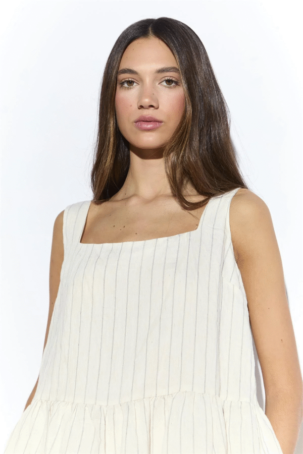 Narrated Women’s Cream Pinstripe Peplum Top. Designed to bring shape and confidence to your everyday look, this cream pinstripe peplum top combines clean lines with a flattering finish. A square neckline adds a modern edge, framing your collarbone with subtle elegance, while the sleeveless design keeps the silhouette fresh and easy to wear. The voluminous peplum hem creates gentle movement and highlights the waist for a feminine touch that feels both structured and effortless. Perfect for work or weekends, it blends versatility with quiet sophistication. Style with tailored trousers or a matching pinstripe piece for a polished, put-together look.