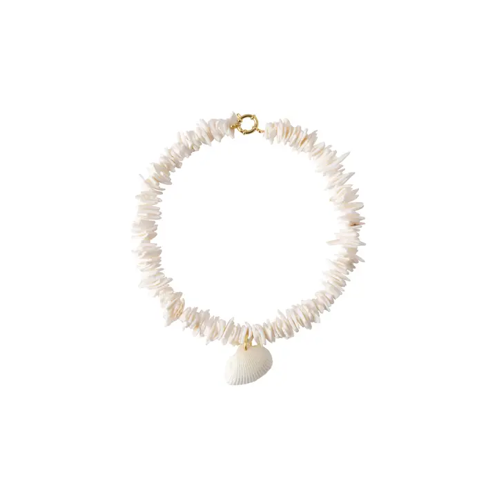 Necklace of shell pieces with a shell in the center, all in natural tones and finished with a golden clasp.