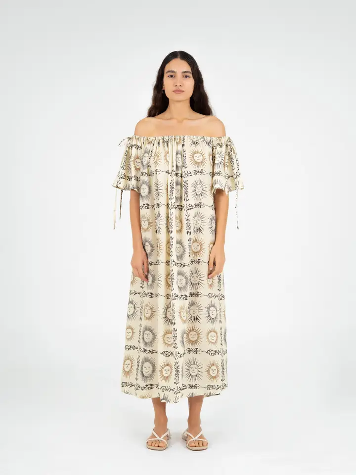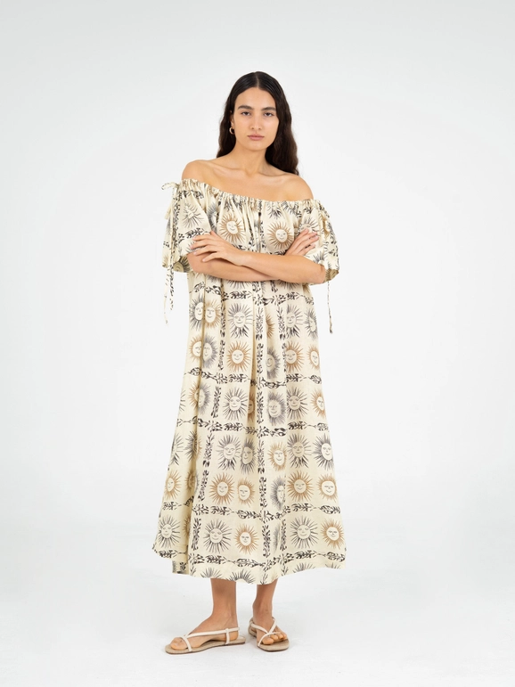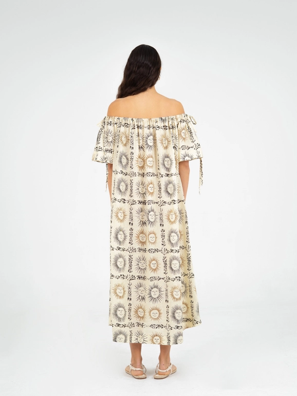 Long printed dress with sun motifs in neutral tones, featuring a relaxed silhouette and bohemian vibe.