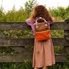 A fig brown + apple tree + vanilla sorbet small backpack. On the front you find an extra pocket. It has adjustable shoulder handles. The body is made from recycled PET bottles, the lining has an apple pattern and is waterproof, the zipper is from YKK On the inside you’ll find an elastic bottle holder and a pocket all over the back that closes with velcro.