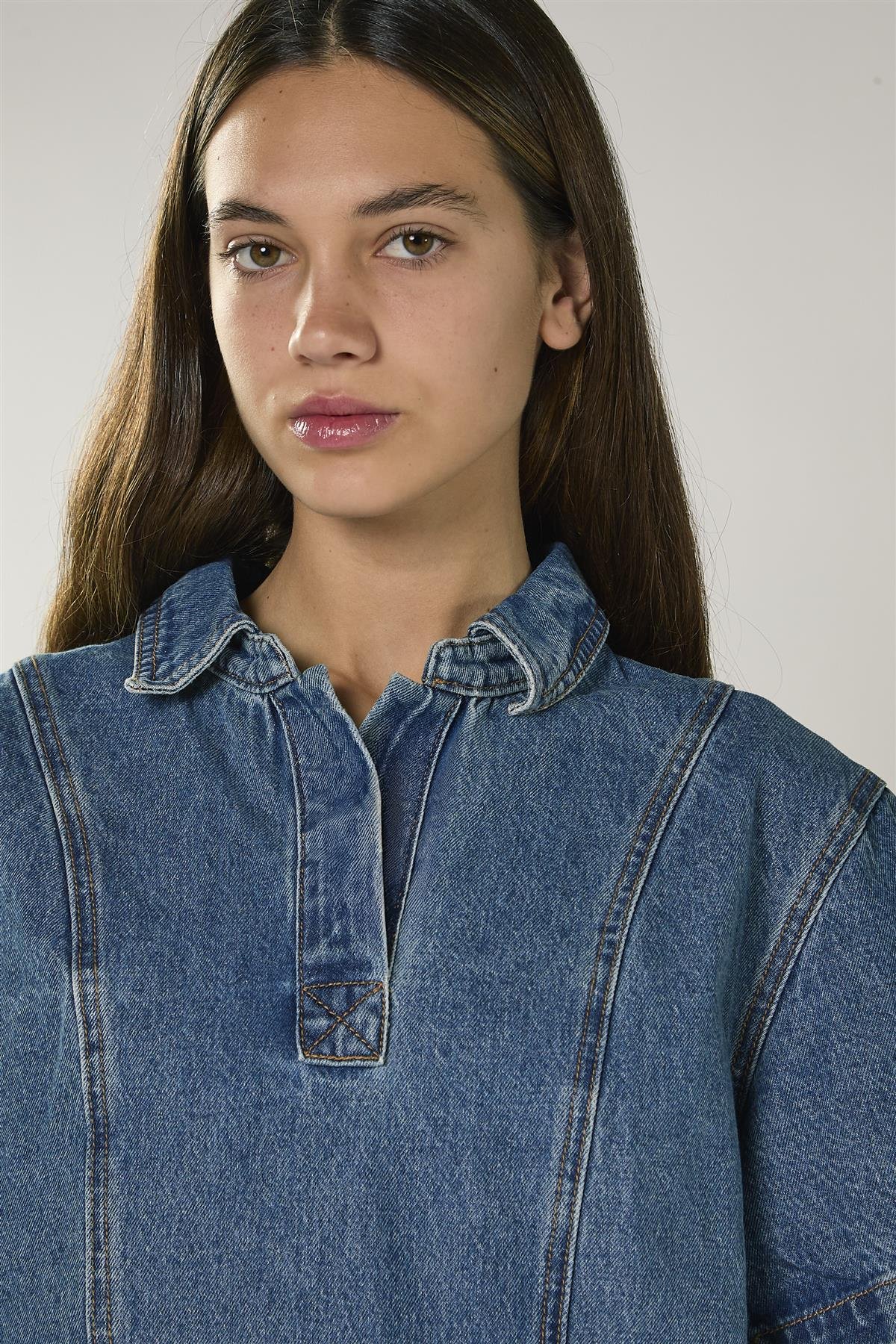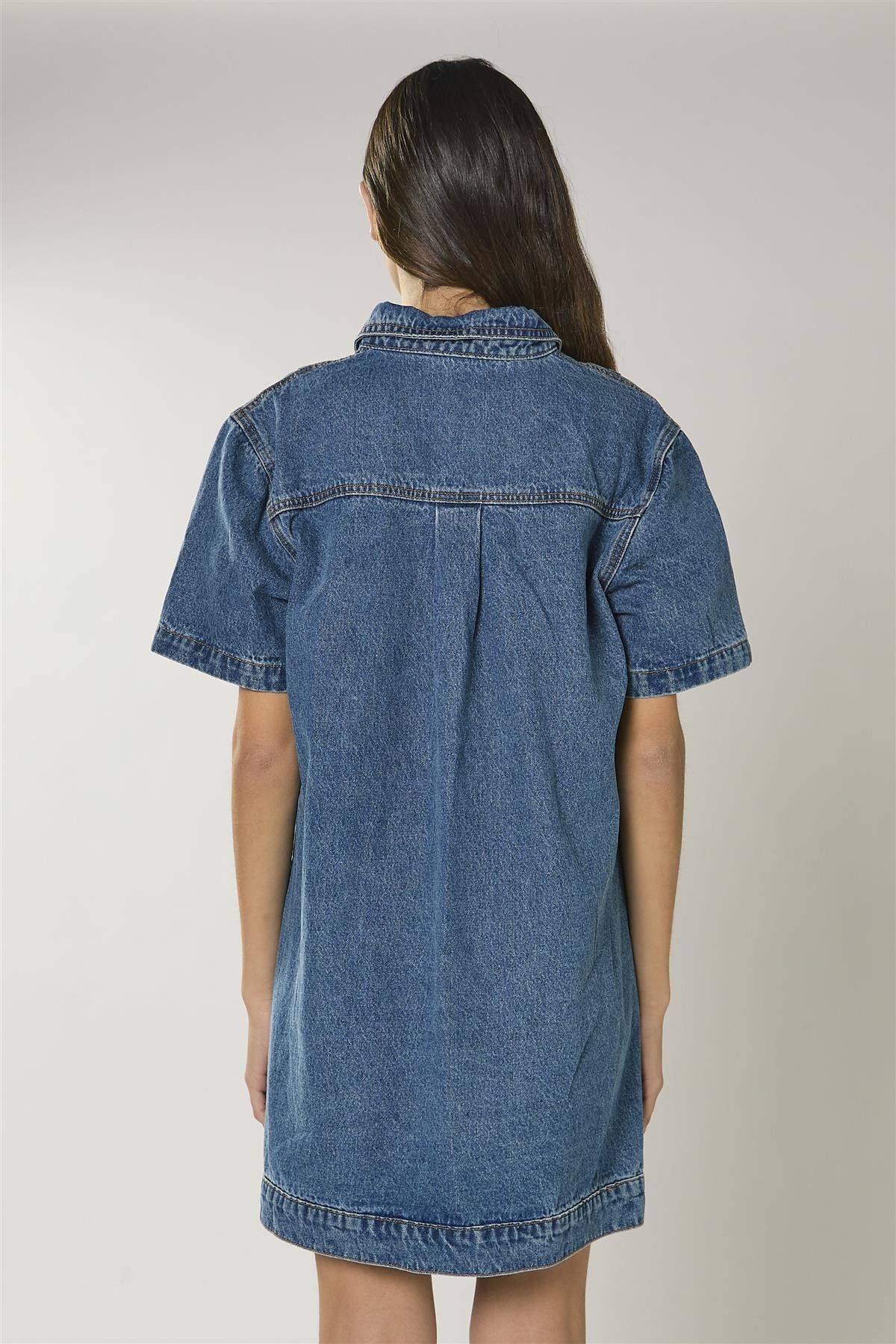 Women’s True Blue Denim Mini Dress. Effortless and versatile, this denim mini dress combines classic design with a relaxed, modern feel. Short sleeves keep the look light and easy to wear, while a collared half-open placket adds subtle structure and a touch of polish. Designed to flatter without restriction, it offers a confident, comfortable silhouette that moves with you throughout the day. Perfect for creating laid-back yet refined outfits, this dress pairs effortlessly with sneakers for a casual vibe or with simple sandals for a polished finish. Style with minimal accessories for a clean, chic look that feels natural and confident.